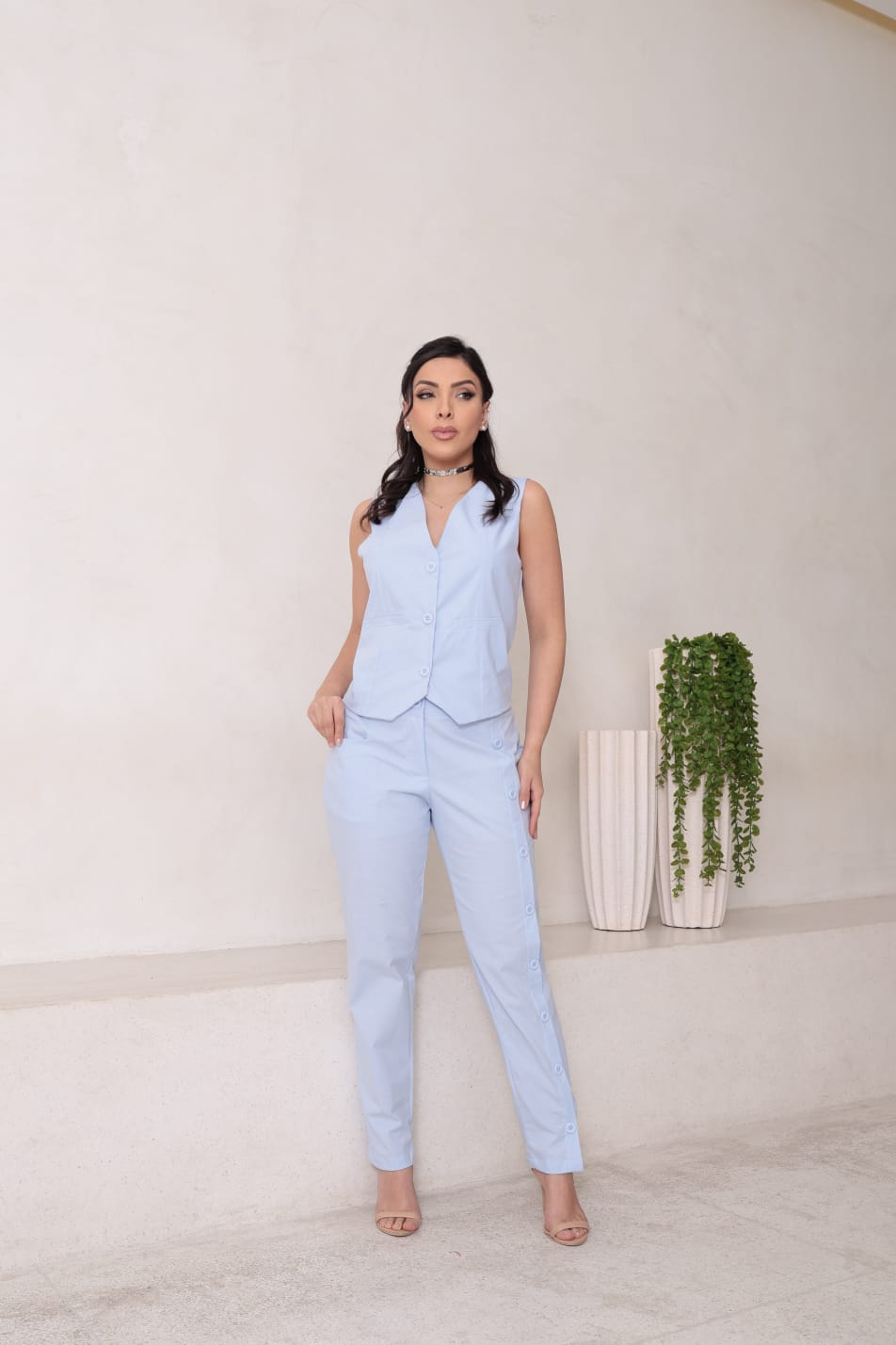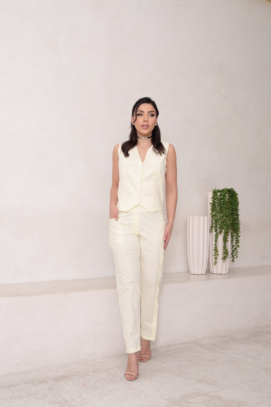Conjunto feminino em tecido tricoline com elastano, com calça que possui botões decorativos e colete com botões funcionais, que traz praticidade e charme ao visual.